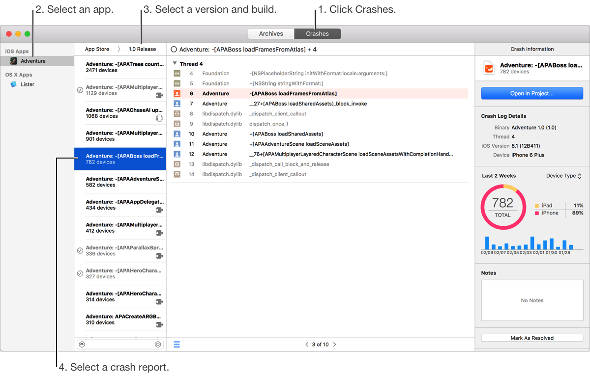 Choose Window > Organizer, and click Crashes.