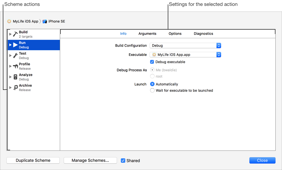 The scheme editor lets you specify settings that affect your workflow. The left column lists scheme actions that correspond to commands in the Product menu: Run, Test, Profile, Analyze, and Archive.