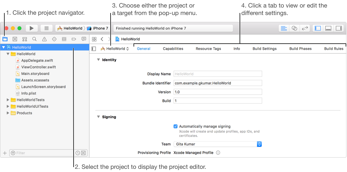 Use the project editor to view and edit your project and target settings, such as build options, target architectures, and code signing characteristics. In the main window, click the file icon (