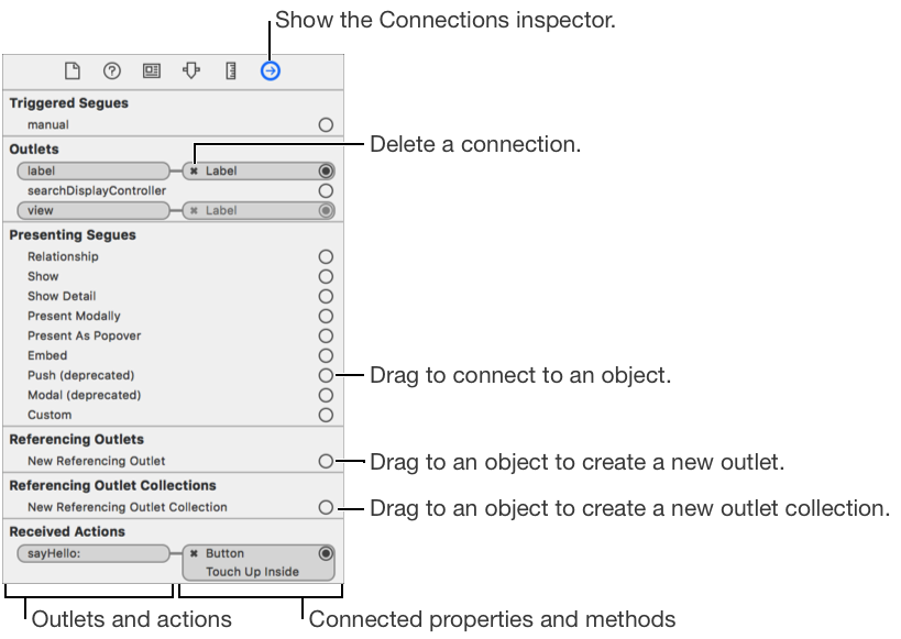 Use the Connections inspector to view, edit, and delete the connections between a user interface object and properties or methods in another object in the user interface file. To open the Connections inspector, click the Connections button (