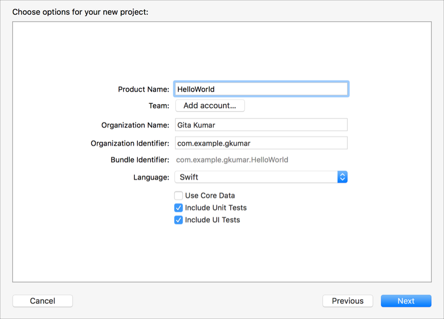 You must enter a product name and organization identifier to continue to the next sheet. You should also enter an organization name (if you don’t belong to an organization, enter your name). The following screenshot shows options for creating an iOS app.