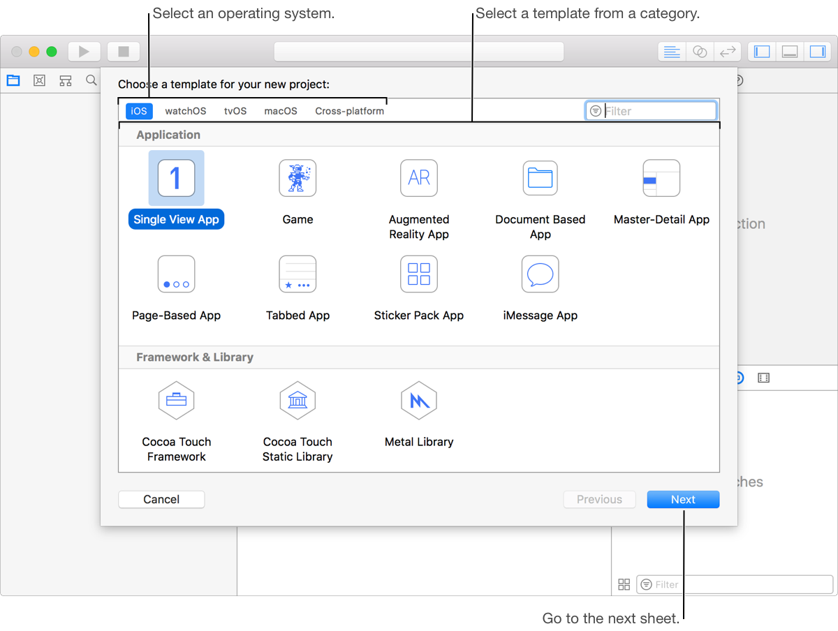 For example, to create an app with a single empty window, for iOS apps, select Single View App; for macOS apps, select Cocoa App.