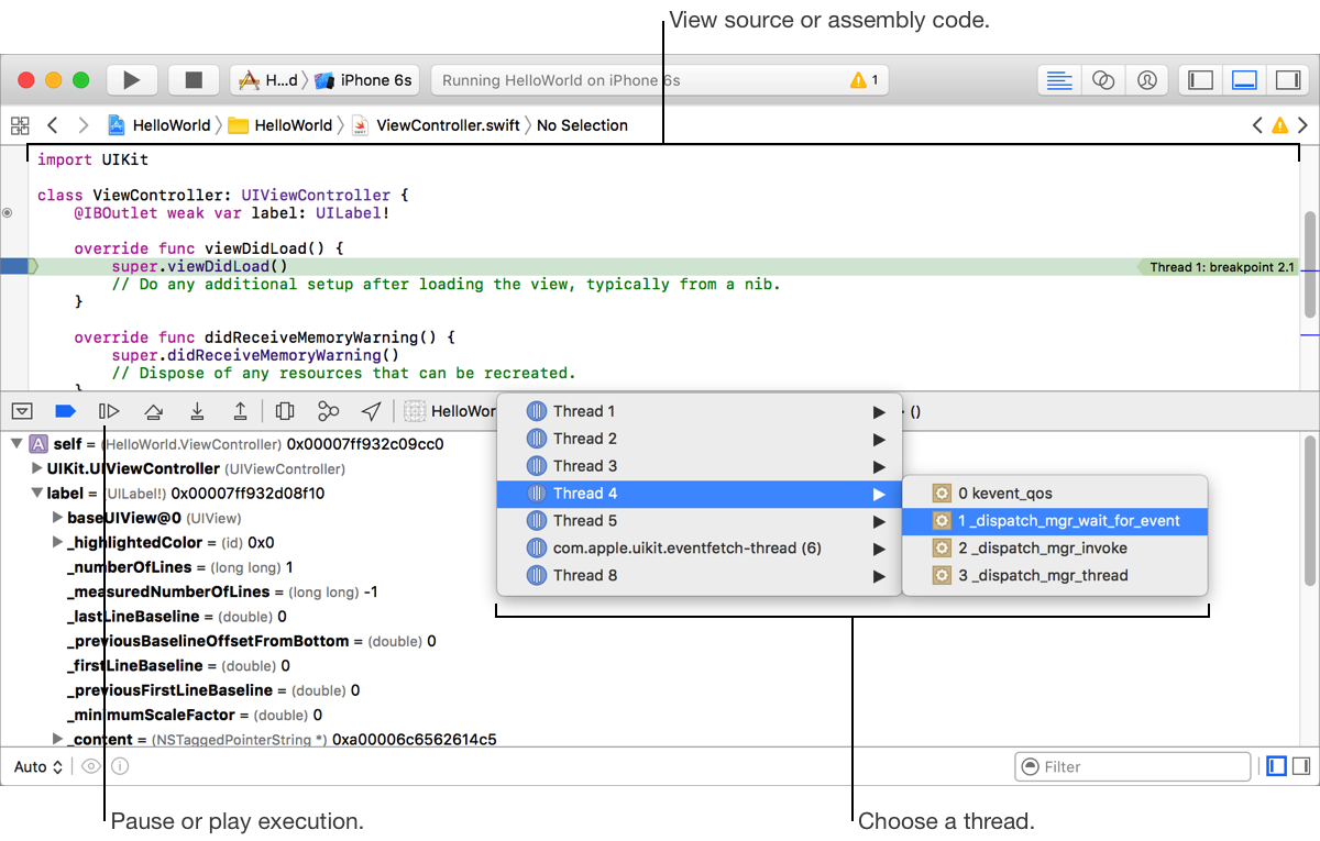 The debug area lets you examine the threads and stacks of your running app. When you select a thread, or a stack within a thread, in the debug bar, Xcode displays the corresponding source file or assembly code in the source editor. The debug area automatically opens when you build and run your app.