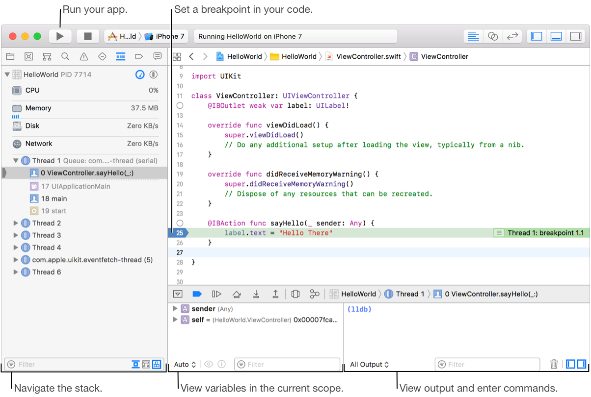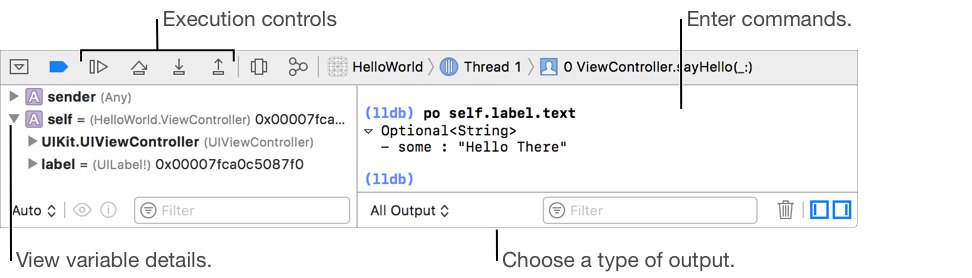 The debug bar appears at the top of the debug area and contains buttons that control the execution of your app—for example, continue, step over, and step in to. The variable area below shows the variables in the current scope. To view a variable, click the disclosure triangle next to it. If the value is an image, you can quick look it directly in Xcode. The console area to the right shows standard output and is where you enter LLDB debugger commands. For example, enter “po [expression]” and the debugger executes the expression. As you type an expression, the debugger offers suggestions for completing it similar to the source editor. The Debug navigator appears to the left of the debug area and allows you to navigate the stack.