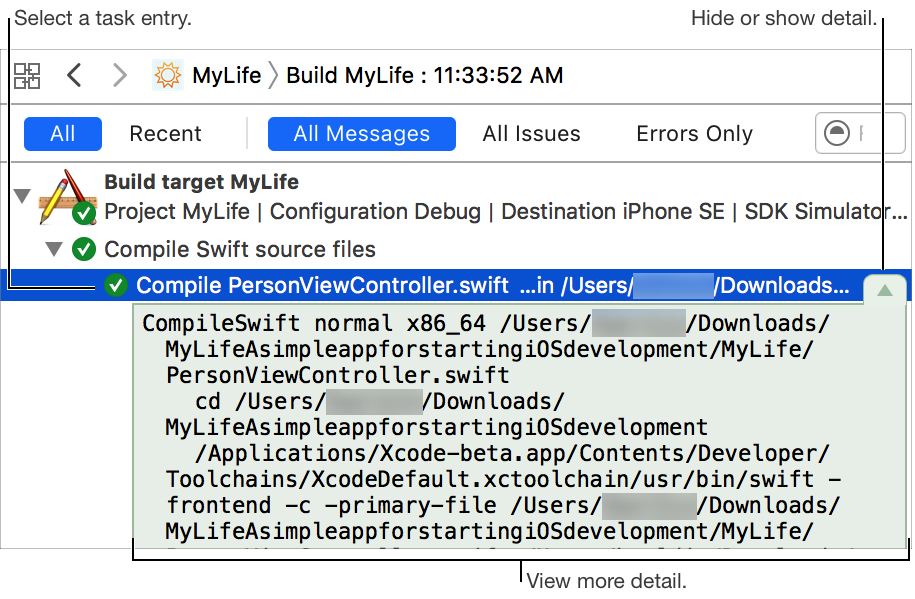 See more detail about a task report error or warning: Option-click the task report entry for the error or warning. The editor area shows all detail for the task and scrolls to the error or warning.