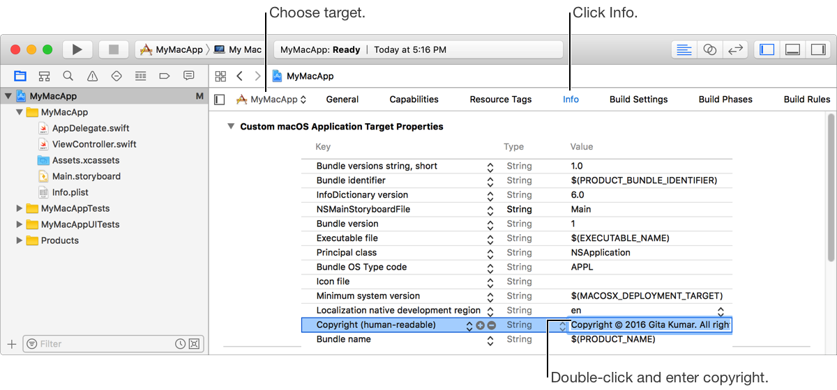 In the target properties table, double-click in the Value column of the Copyright (human-readable) row.