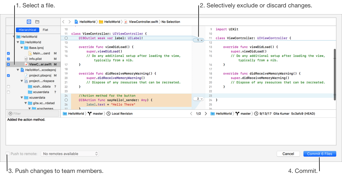 To save the changes you made to files, choose Source Control > Commit. In the sheet that appears, review the changes and exclude or discard specific changes. Then enter a commit log message, optionally select “Push to remote,” and click the Commit button.