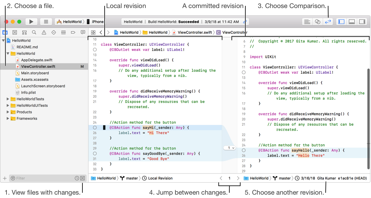 To see the changes you’ve made to a file, select the file in the Project navigator, choose Comparison (