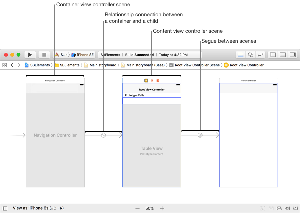 A storyboard is a type of user interface file that you edit using Interface Builder. The components a storyboard are: