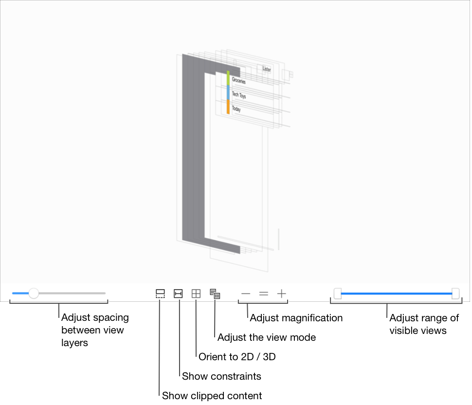 ) to display the view hierarchy with the clipToBounds property of each view set to false. This results in displaying views whose bounds rectangle is partially or completely outside the bounds rectangle of one or more superviews.