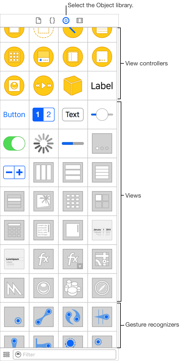 ) in the library bar. To add an object to your interface, drag the object from the library to the Interface Builder canvas. To filter the objects shown in the library, type text into the filter bar.