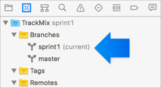 If the branch you created is from the current working copy, Xcode switches the working copy to the new branch and appends “(current)” to the name in the Source Control navigator.