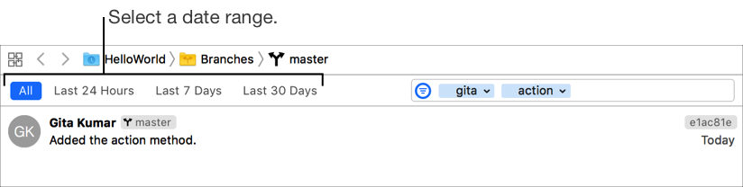 Disclose Branches (click the disclosure triangle next to Branches), then select a branch (for example, select master).