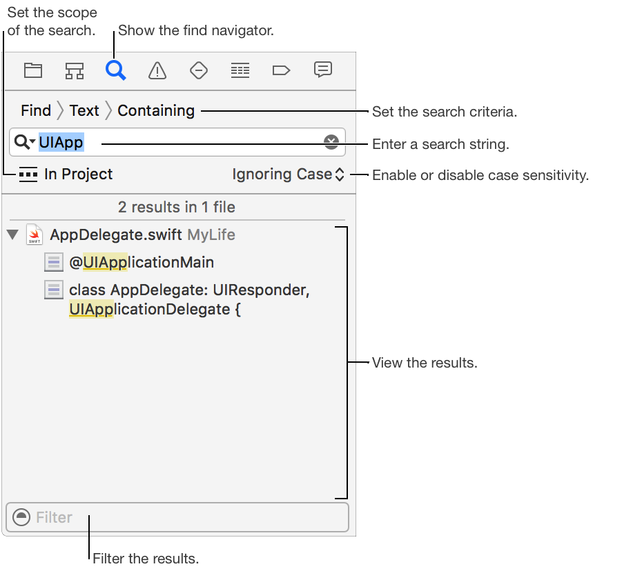 Use the Find navigator to perform search and replace operations across your project. You can search text, references, definitions, and the call hierarchy. Replacements can only occur when searching text. The Find navigator supports case sensitive searching and regular expressions. You can also scope your search to the entire project or specific files. To open the Find navigator, click the Find Navigator button (