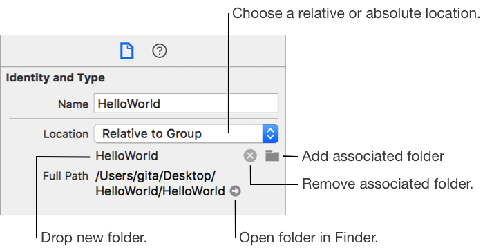 Choose a relative or absolute location: In the File Inspector, choose a relative or absolute location from the Location pop-up menu. For example, choose Relative to Group (recommended) to preserve references when you move your project folder.