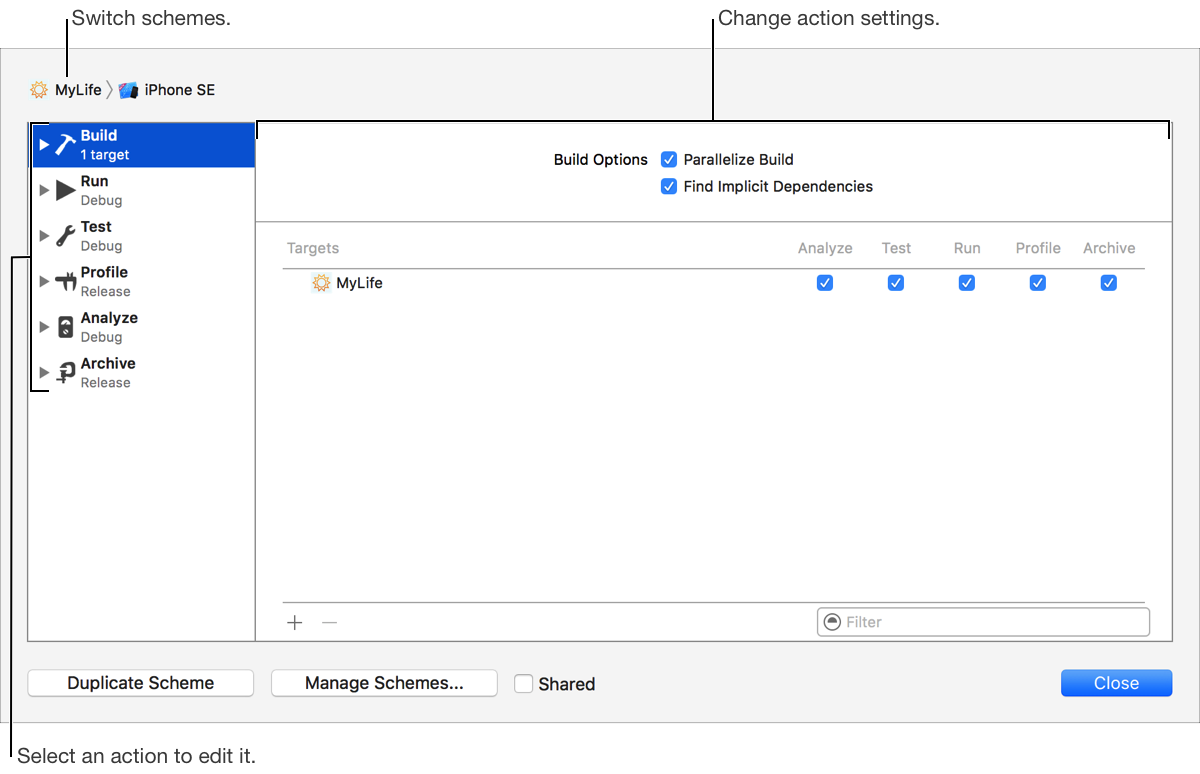 Use the scheme editor to configure the schemes in your project.