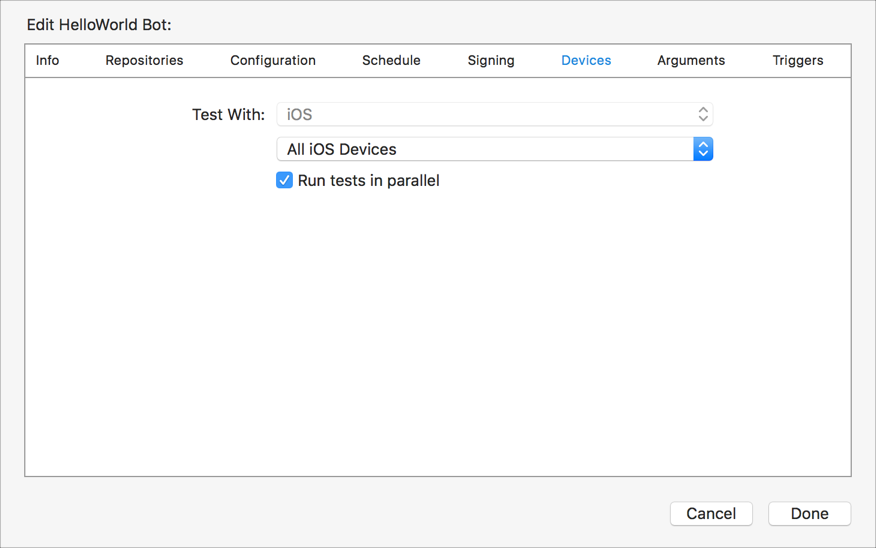 You can configure a bot to run your app on multiple devices and simulators connected to your Xcode Server.