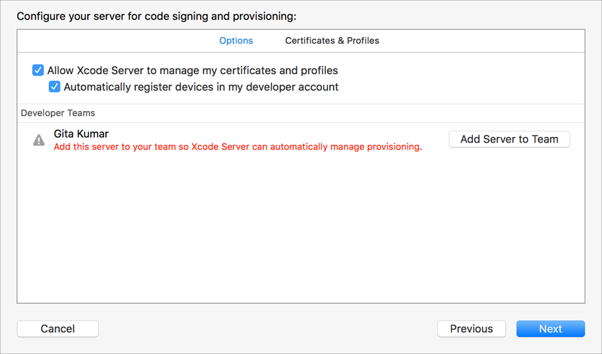 If you use automatic signing, allow Xcode Server to manage signing for you. You must select the “Automatically register devices in my developer account” checkbox if the devices aren’t registered yet. Then click Add Server to Team so that the server can register new devices.