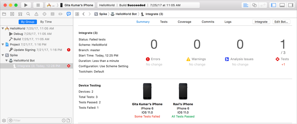 After you configure the bot, connect all the devices to the Mac running Xcode Server and run an integration to test the configuration. Then view the bot and integration results.