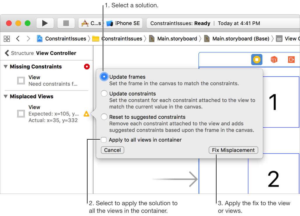 Use the Interface Builder canvas to find and resolve issues for one or more views. Use the outline view to find and resolve all of the issues for a view controller. Use the Auto Layout tools to resolve issues for the selected views.
