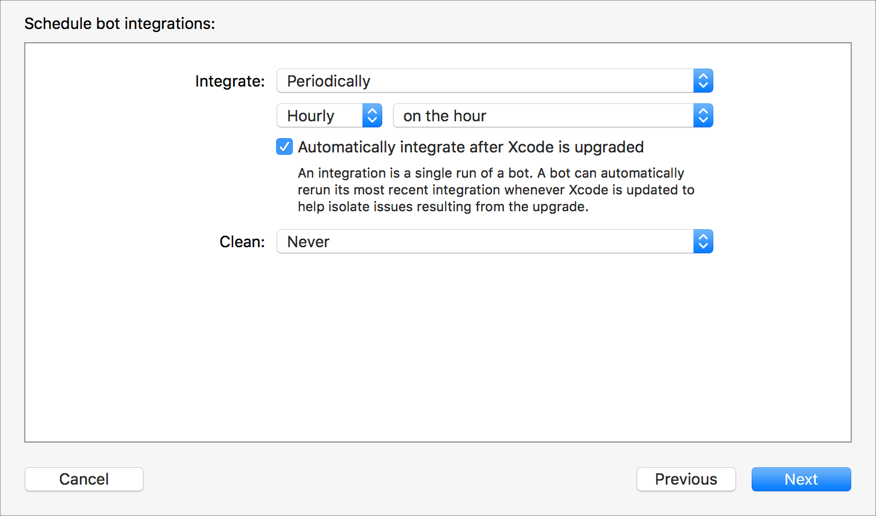 Specify how frequently you want to run integrations and whether you want to clean products before building them. You can schedule the bot to perform integrations periodically (hourly, daily, or weekly), on every commit, or manually. Similarly, you can schedule cleaning before each build, daily, or weekly.