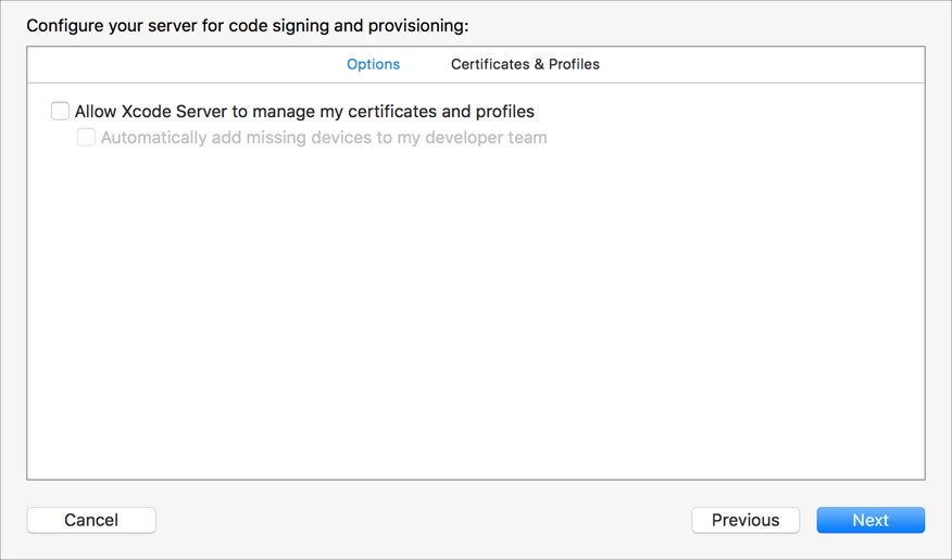 For example, the server can create missing signing certificates, register devices, and generate provisioning profiles. To learn more about these settings, go to Allow Xcode Server to manage signing for you.