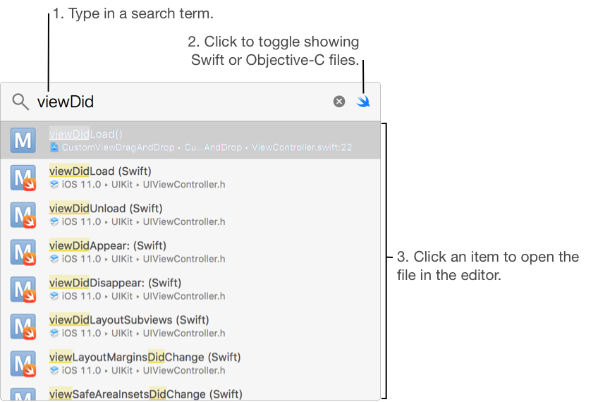 To open a file in your project or in the system frameworks that contains specific text, choose File > Open Quickly (Command-Shift-O) from anywhere in your project. In the search field popover, enter the desired text. The list of matching files updates as you type. Double-click an item in the list to open the file in the main editor. Click the Swift button (