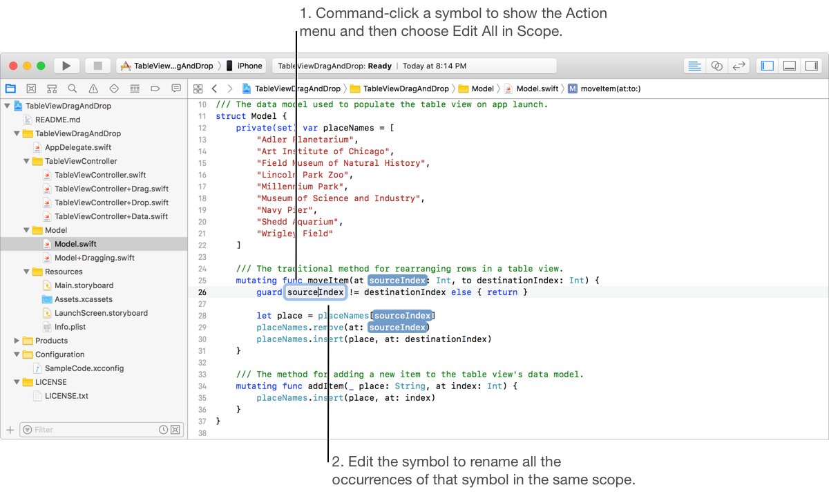 To edit all occurrences of a symbol in the current scope, choose Edit All in Scope in the Action menu. Xcode highlights all occurrences of the symbol in the current scope. As you edit the symbol, all occurrences are updated with the changes. Press Return to accept the changes or Escape to cancel.