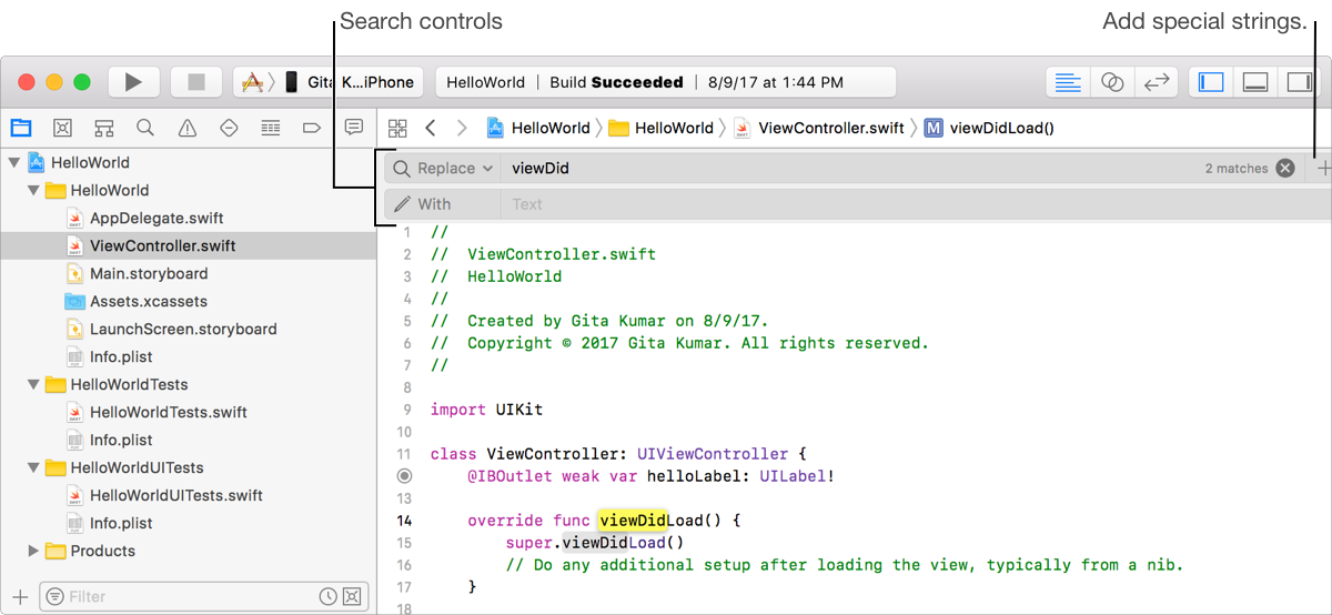 ) in the navigator area. Enter text in the search field followed by Return, and Xcode displays occurrences of the string in the entire project. Select an occurrence to view it in the editor area. To scope the search, above the text field, choose a string type and options. To find all occurrences that start with a string, choose Find > Text > Starting with. To find symbols that start with a string, choose Find > Definitions > Starting with.