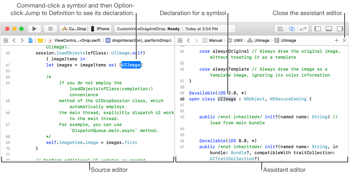To view a symbol declaration, choose Jump to Definition in the Action menu. The file containing the definition is opened to the declaration of the symbol. Clicking a symbol in the list opens the file in the main editor. To open the file in the assistant editor, hold the Option key and choose Jump to Definition. To remove the assistant editor, click the close button in the upper-right corner. If there is more than one possible definition for the highlighted symbol, the Action menu then shows a list of possible symbols. Choose a symbol to open the file.