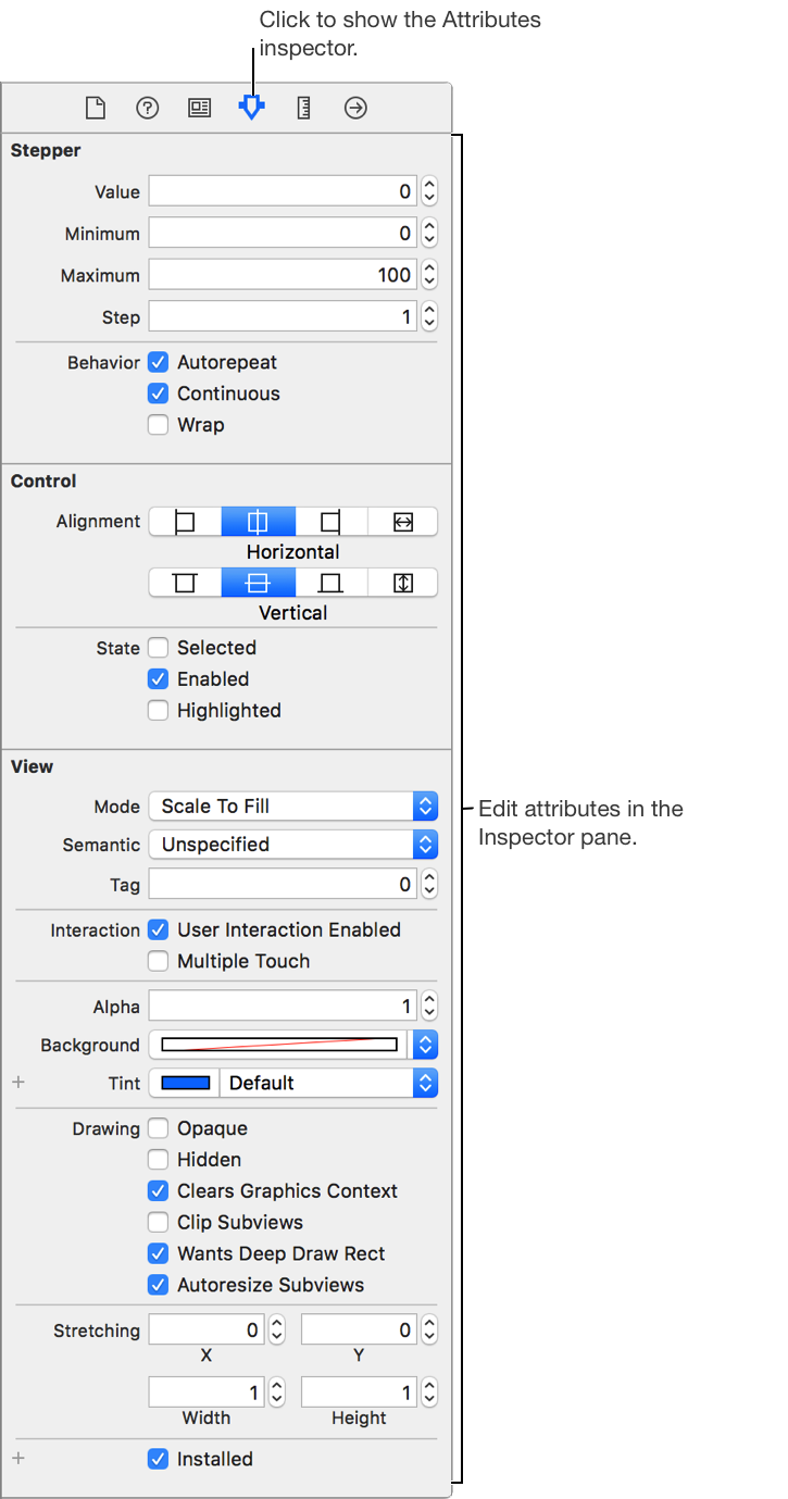 The attribute editors are grouped by class membership in the inheritance hierarchy for the interface object. For example, the attribute editors for a stepper are grouped into the attributes for UIStepper, then the attributes for UIControl, and then the attributes for UIView. There may be other groups of attributes such as the Installed checkbox used for adaptive user interfaces.