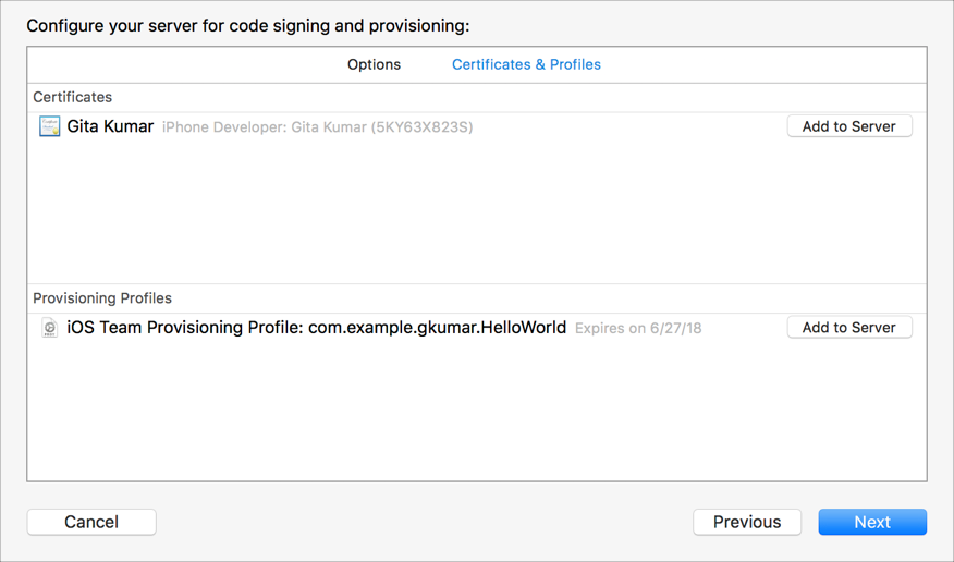 On the Options pane, select “Allow Xcode Server to manage my certificates and profiles.”