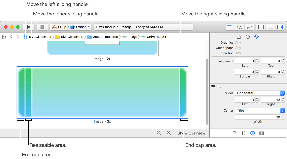 Use the Xcode Slicing feature to specify the dimensions of a resizable center area of an image and to optionally specify end caps, which are areas of the image that should not be filled by the resizable area