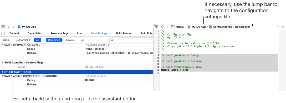 Select a build setting in the Build Settings pane and drag it into the configuration settings file in the assistant editor.